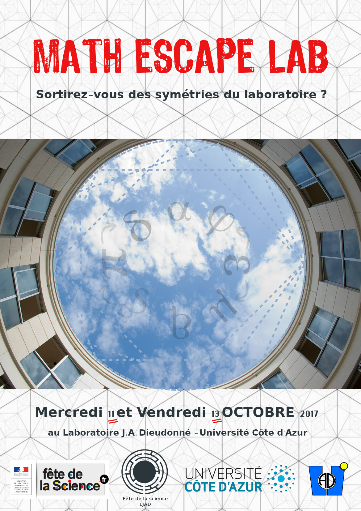 Les élèves seront répartis en cinq groupes et devront résoudre des énigmes mathématiques pour passer de salles en salles et déchiffrer le code permettant de découvrir le lieu où se cache la clef ultime. L’architecture circulaire du bâtiment de recherche, qui fait la particularité du LJAD, et l’utilisation d’un cadran d’Alberti, procédé de cryptage inventé au XVe siècle, rendront à l’évidence le parcours plus corsé. Les énigmes ne requièrent pas de connaissances mathématiques élevées, mais de la logique, du sens géométrique et... probablement quelques applications du bon vieux théorème de Pythagore. Durant leur parcours, tous les groupes visiteront également une exposition dans la bibliothèque de mathématiques du laboratoire, où ils découvriront une collection de livres anciens et des objets mathématiques divers. De plus, chaque groupe sera accompagné par un membre du laboratoire (principalement des doctorant(e)s), qui aidera les élèves à résoudre les énigmes, et qui organisera aussi un échange informel où il pourra présenter son parcours d’étudiant, la vie professionnelle d’un chercheur en mathématiques, et répondre aux questions des élèves sur leur propre orientation post-bac.