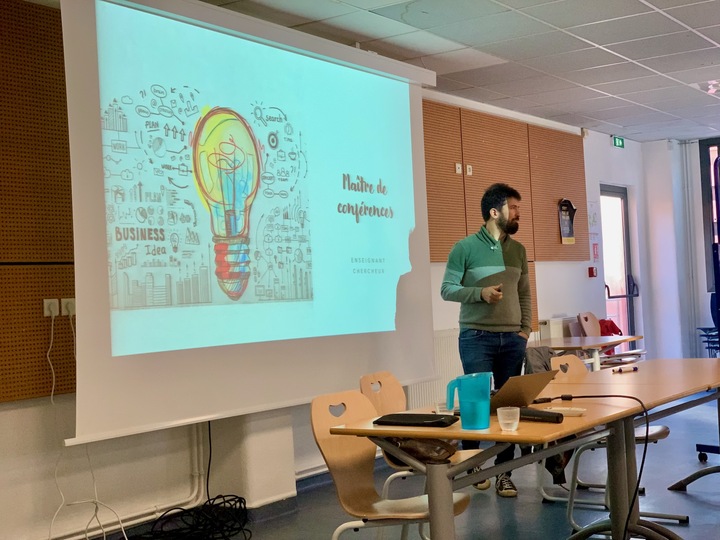 Intervention de Rémi Catellier sur son métier d’enseignant-chercheur et sur la recherche en mathématiques devant les 150 élèves de 3e du collège Picasso de Vallauris.