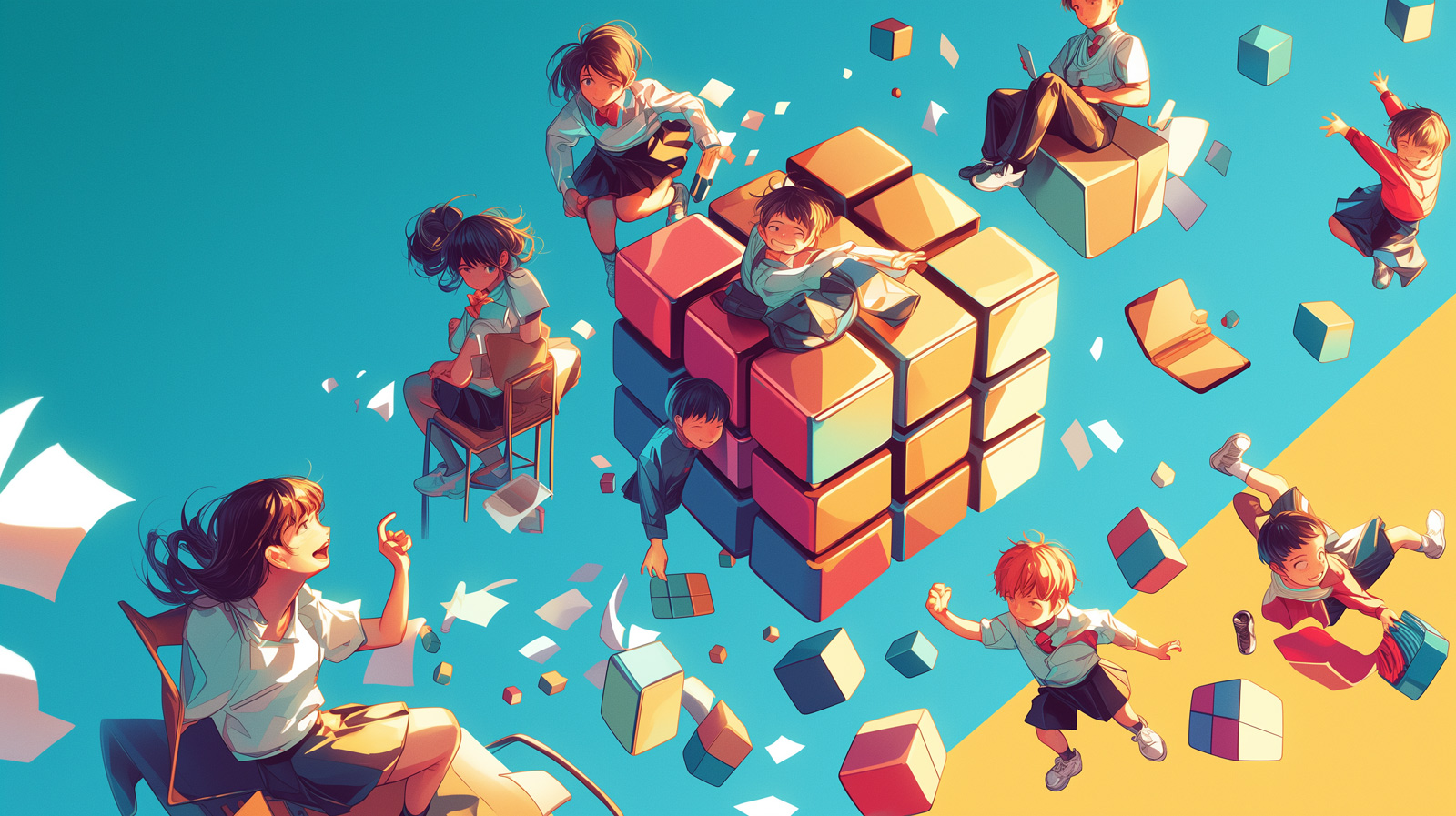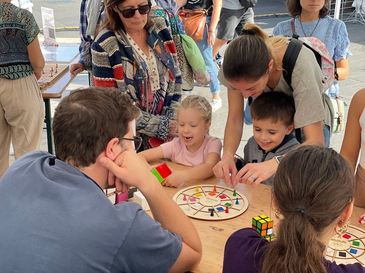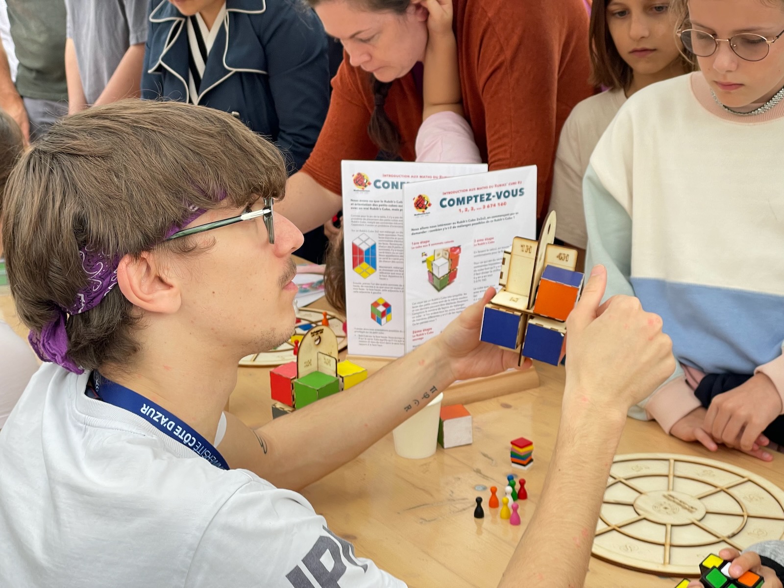 Cet atelier a été réalisé à l’occasion des 50 ans du Rubik’s Cube par 3 étudiants de L3 (Alexis Roeckel, Romain Soyer et Thibault Jaouen) dans le cadre des « engagements citoyens ». Il se décompose en plusieurs étapes. La première est accessible même pour des élèves primaires sous forme de jeu et peut être un atelier à part entière pour introduire les groupes sans le dire.