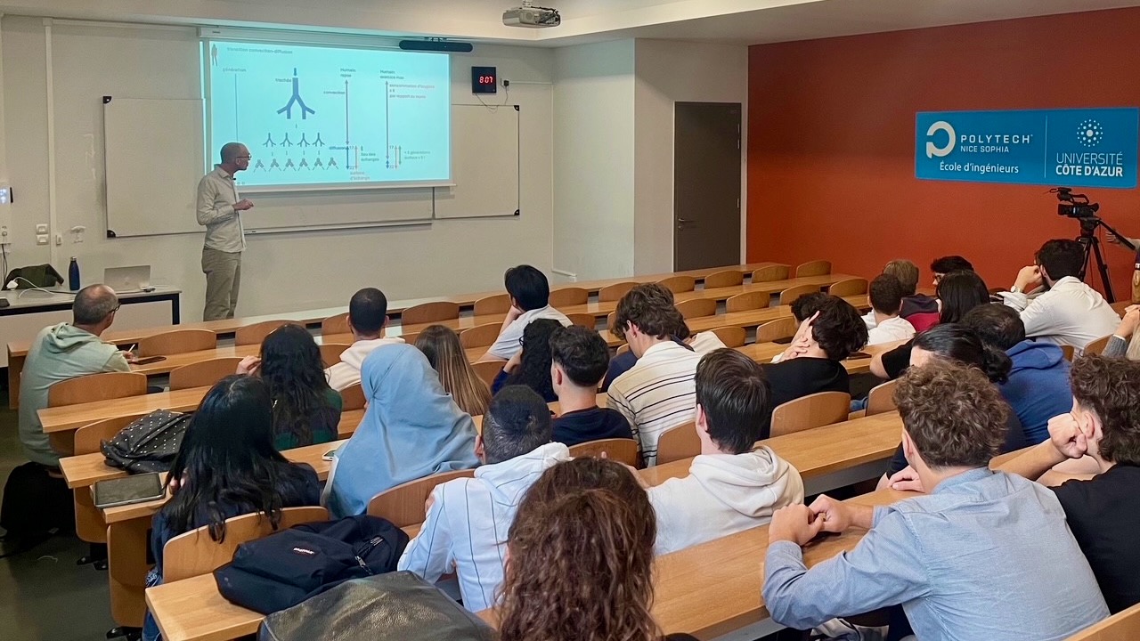 Ce matin, conférence de notre collègue Benjamin Mauroy « La course de l’éléphant : un conte mathématique » devant la 50aine d’étudiant·es de mathématiques appliquées de Polytech Nice Sophia.