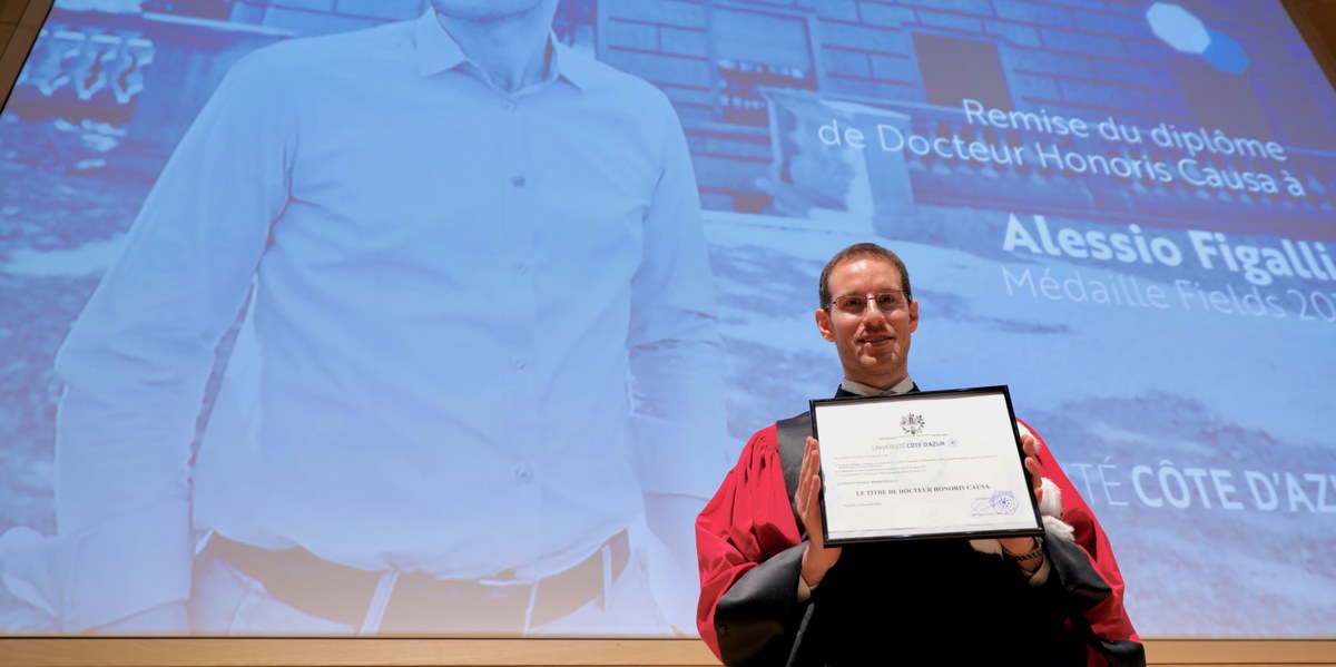 Alessio Figalli a reçu, le 10 décembre 2018, le diplôme de « Docteur Honoris Causa » des mains de Jean-Marc Gambaudo entouré de Fabrice Planchon, Professeur de mathématiques à Université Côte d’Azur et Président du jury d’admissibilité en mathématiques au CNRS l’année du recrutement d’Alessio Figalli, Ludovic Rifford, Professeur de mathématiques à Université Côte d’Azur et Directeur du Centre International de Mathématiques Pures et Appliquées et Yann Brenier, Directeur de recherche CNRS à l’ENS Ulm et ancien Membre du Laboratoire Jean Alexandre Dieudonné.